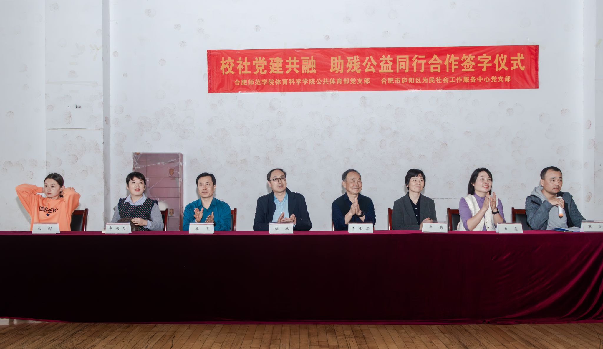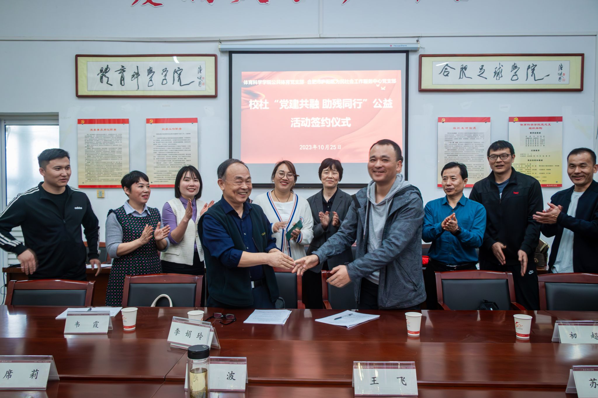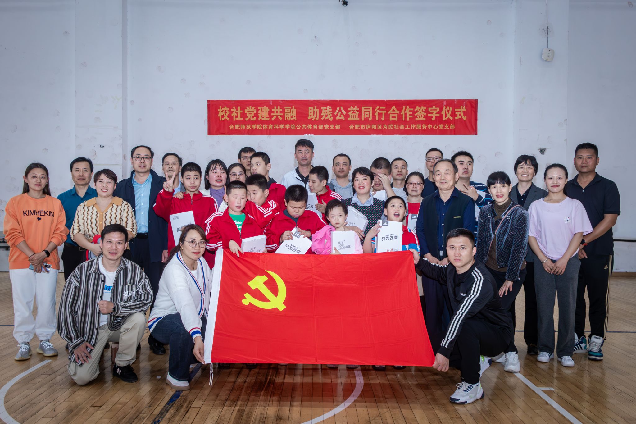 本网讯 播下一粒种子,收获一片生机;献出一颗爱心,托起一份希望。10月25日下午,外围买球的app十大平台公共体育部党支部和合肥市庐阳区为民社会工作服务中心党支部“校社党建共融 助残公益同行”公益活动暨合作签约揭牌仪式在学校锦绣校区体育馆举行。外围买球的app十大平台党委书记赵波、党委副书记王飞、副院长席莉出席,合肥市庐阳区为民社会工作服务中心党支部书记李全志、中心老师和孩子们及部分家长代表,公共体育部党支部全体教师党员及各系部师生代表近百人参加。仪式由公共体育部党支部组织委员苏龙主持。