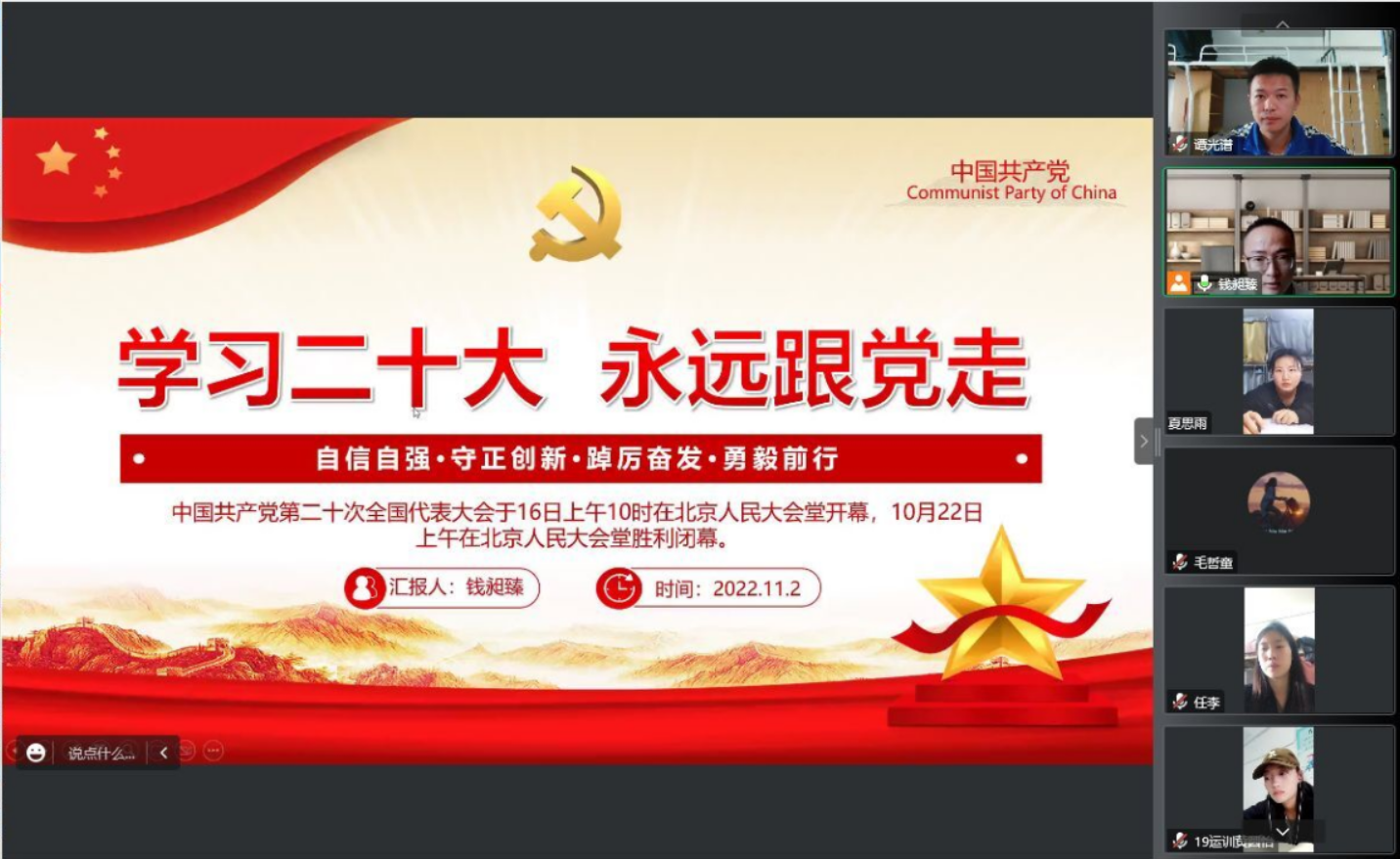 本网讯 为引导学生认真学习党的二十大精神,坚定不移听党话、跟党走。11月2日下午,外围买球的app十大平台学生党支部通过腾讯会议召开线上专题学习会,围绕党的二十大报告进行学习交流。会议由外围买球的app十大平台党政秘书、组织员钱昶臻主持。
