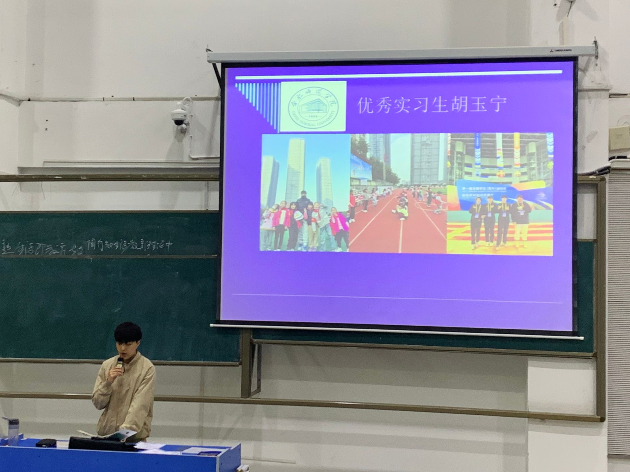 优秀实习生代表胡玉宁向同学们分享了自己的实习经历、收获及感受。她分享了初次上课的紧张,后续的进步,对课堂驾驭能力的提升过程;分享了从教学实践、班级管理以及实习日常三个方面自己的心得体会;分享了教学事例和自己在实际上课过程中的收获;分享了在实习中学习到的一些实用教学技巧。