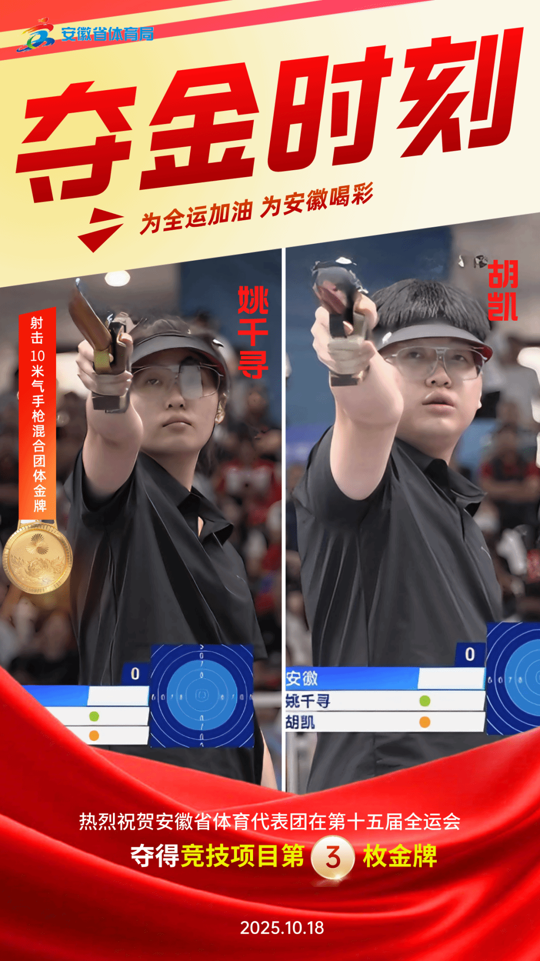买球官网学子在本届全运会中表现亮眼。2021级体能训练专业胡凯与队友姚千寻配合,在射击项目10米气手枪混合团体比赛中战胜山东队,勇夺金牌,该金牌也是安徽省体育代表团在本届全运会竞技体育项目中获得的第3枚金牌。此外,胡凯还助力安徽队夺得男子10米气手枪团体金牌,成就“双金”佳绩。