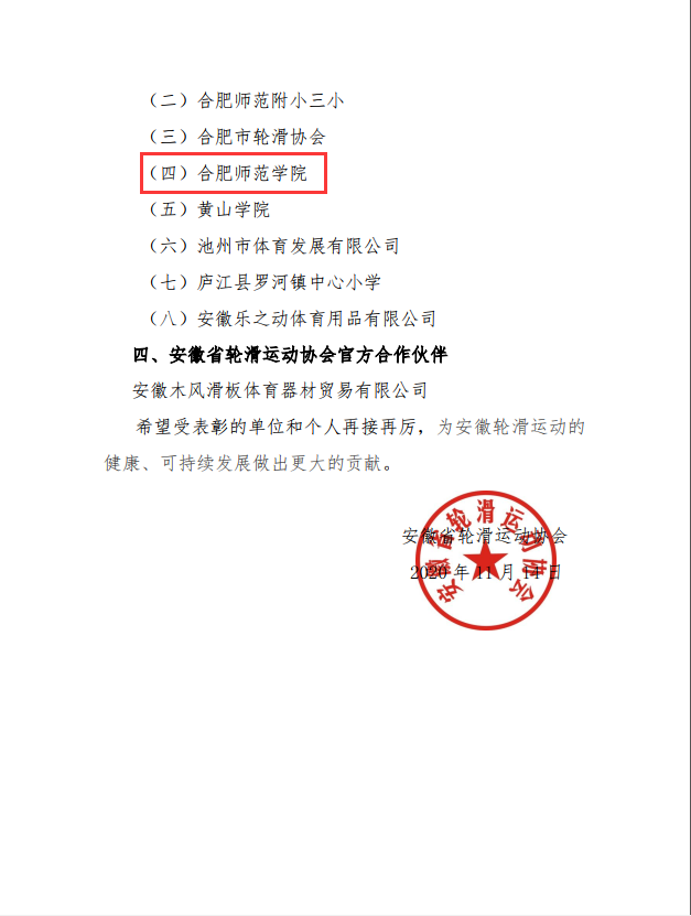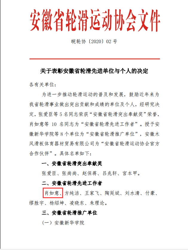 外围买球的app十大平台及教师肖如意受安徽省轮滑运动协会表彰,肖如意老师获评安徽省轮滑先进工作者。外围买球的app十大平台获评安徽省轮滑推广单位。