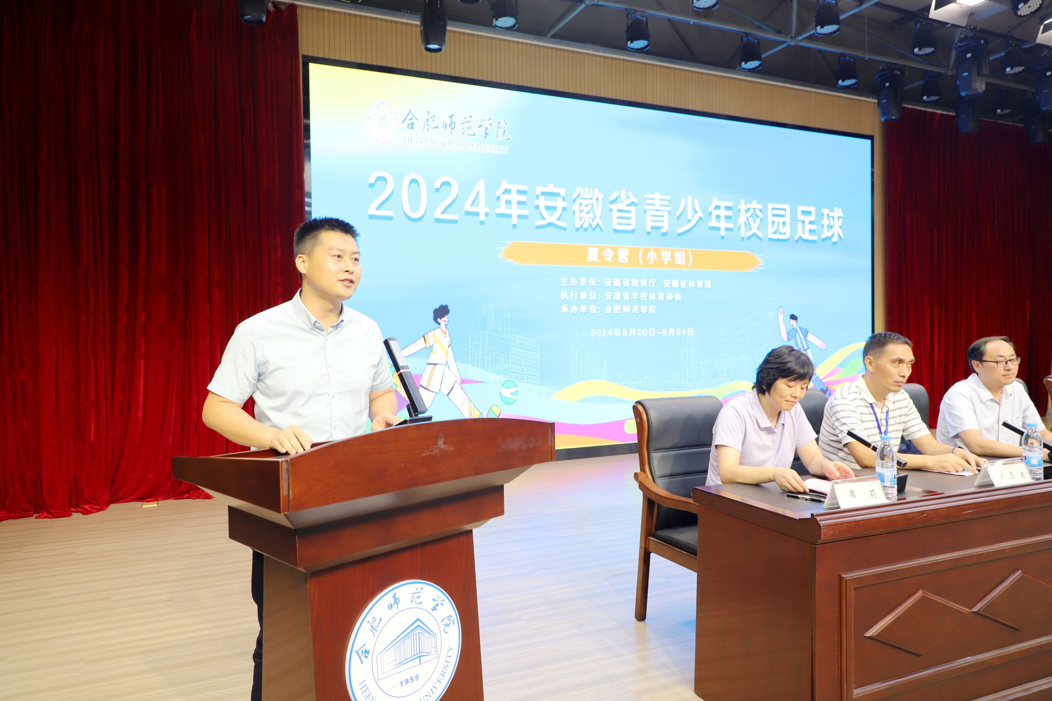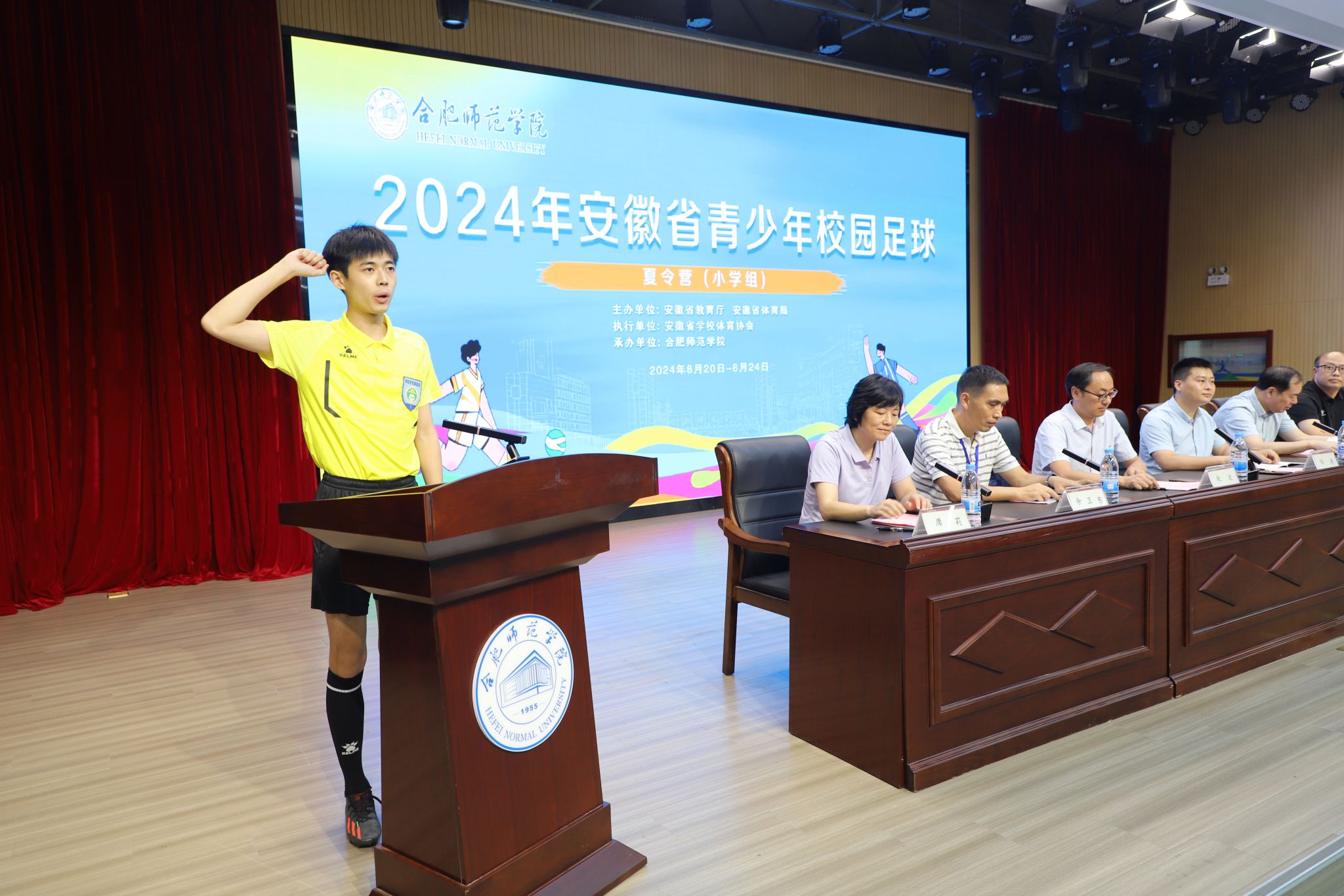 开营仪式上,赵波致开幕辞,代表学院向夏令营的成功开营表示最热烈的祝贺,席莉主持会议并介绍了本次夏令营活动相关准备情况,孙伟代表省学校体育协会致辞。余卫东就夏令营安全等活动相关要求进行强调。裁判员代表马乐、运动员代表李玥桐郑重宣誓,表示将严格遵守比赛规则和赛场纪律,确保活动有序开展、顺利进行。在热烈的掌声中,陆涛宣布2024年安徽省青少年校园足球夏令营(小学组)正式开营。