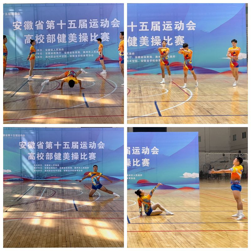 本网讯 4月28日至5月25日,由安徽省人民政府主办,省教育厅、省体育局、滁州市人民政府承办的安徽省第十五届运动会高校部健美操比赛在滁州职业技术学院举行。本次比赛设有甲组(非体育专业本科院校)、乙组(非体育专业高职院校)、丙组(体育专业本科院校)、丁组(舞蹈表演专业)四个组别。共有来自全省50多所高校的500多名运动员参赛。买球官网组队参加丙组比赛,获得丙组五人操、三人操、女子单人操、混合双人操等四个第一名和男子单人操第四名,买球官网健美操项目首次在省运会上获得冠军。