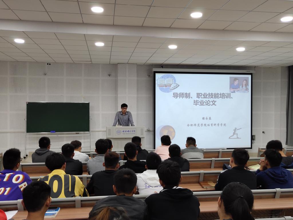 本网讯 为了进一步让体育专业新生充分了解导师制,提高专业训练能力。10月10日晚,外围买球的app十大平台在滨湖校区博学楼D101教室开展以“导师制,职业技能培训和毕业论文指导”为主题的新生入学教育,运动训练系主任游永豪副教授主讲,辅导员张康康及2019级全体新生参加。