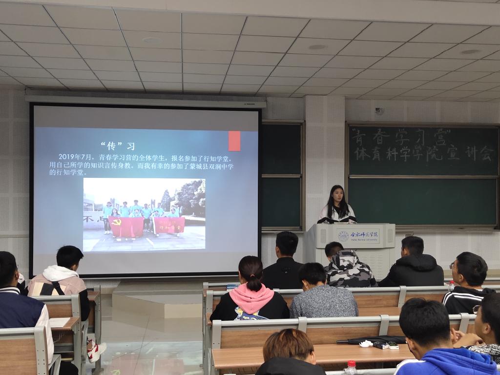 本网讯 为了帮助2019级新生更好地了解“青春学习营”,11月17日晚上,外围买球的app十大平台在滨湖校区博学楼A108教室开展“青春学习营”主题宣讲活动。此次活动由首届“青春学习营”学员2017级运动训练专业麻艳雯同学主讲,体科院2019级全体新生参加。