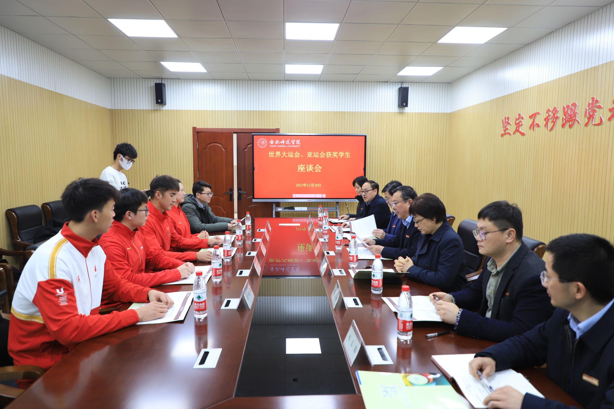 12月28日下午,在成都第31届世界大学生运动会和杭州第19届亚运会上取得优异成绩的买球官网学子夏琦、徐桥、俞思源、苏雨恒等四位同学从训练队回到学校,接受学院年度学生工作表彰。会前,院党委书记徐成钢,党委副书记、院长方东玲在锦绣校区共青之家与获奖同学亲切见面并举行座谈,院党政办、教务处、学生处、团委和外围买球的app十大平台负责人参加座谈交流。