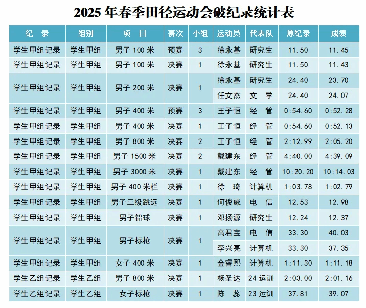 本届运动会学生甲组共15人次打破校史纪录,呈现“全面突破、多点开花”的喜人态势。研究生徐永基两度刷新男子100米纪录,并与文学院任文杰先后改写男子200米纪录;经济与管理学院王子恒包揽男子400米、800米双项冠军并破校纪录;经济与管理学院戴建东在男子1500米、3000米项目中双双打破纪录;计算机与人工智能学院徐琦、电子信息与集成电路学院何俊威、研究生邓扬源分获男子400米栏、三级跳远、铅球项目新纪录;电子信息与集成电路学院高君宝、计算机与人工智能学院李兴亮、计算机与人工智能学院金睿熙则在男子标枪、女子400米项目中实现历史性突破。